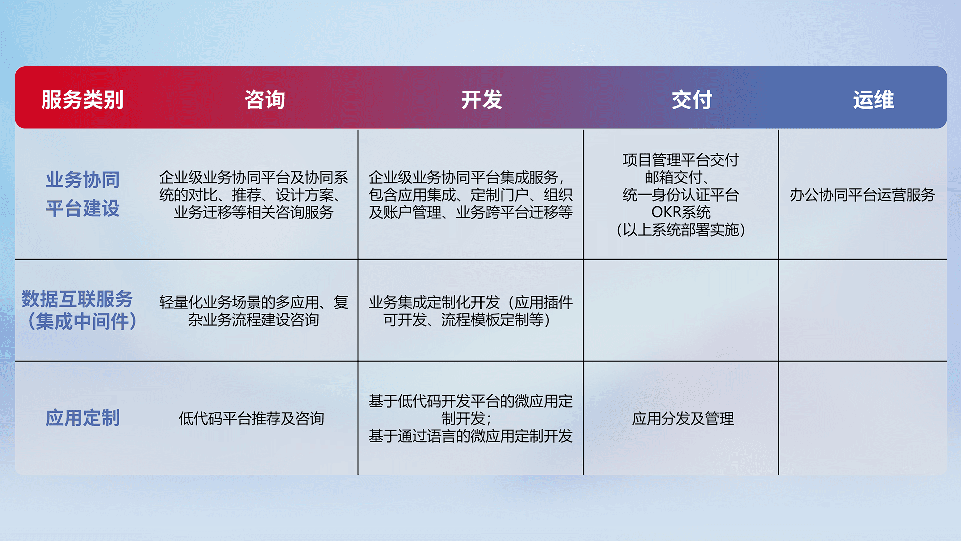 针对钉钉、、企微、、、IDaas等平台级产品提供产品的规划、、方案、、、、交付、、、定制化开发等服务,,,,实现如统一协同办公、、、、智能客户服务、、混合会议管理、、、智能数据查询、、等业务场景,,,实现数字化转型。。